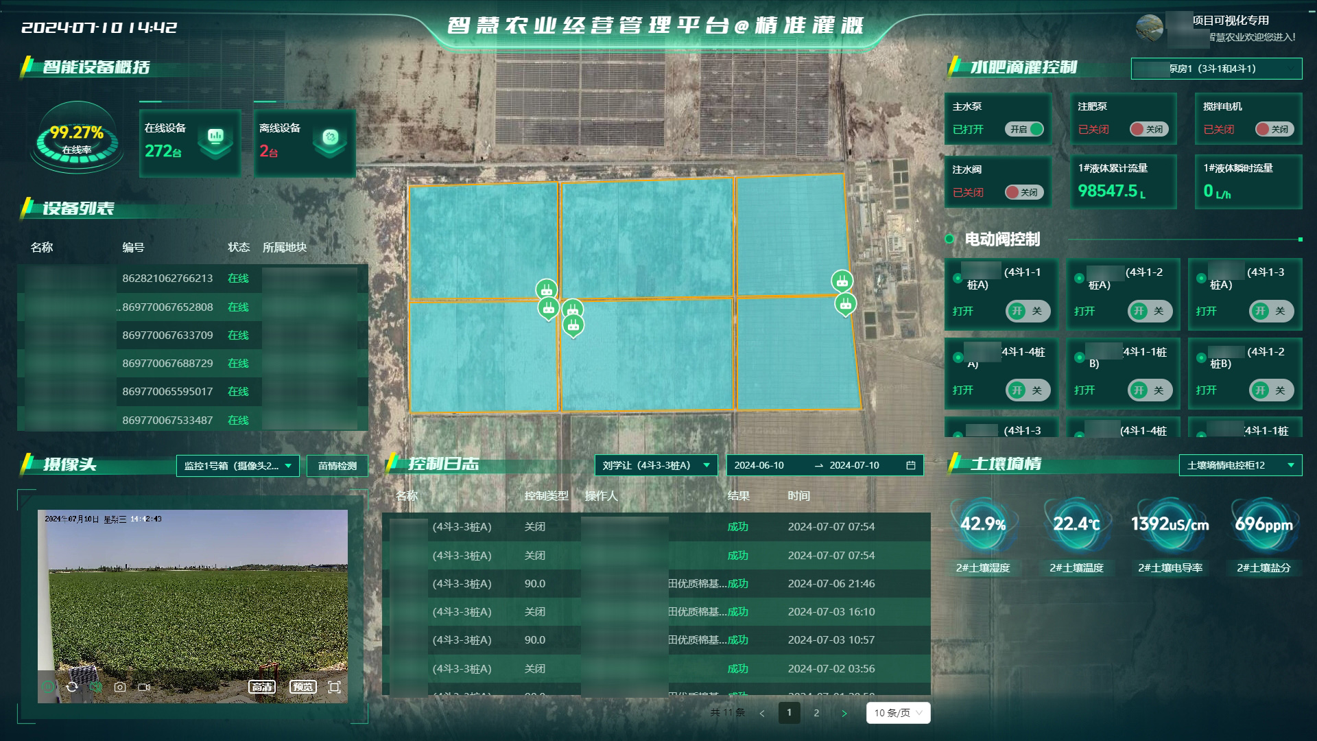 可视化大数据平台:集成基地信息、物联设备、农事信息等数据,搭建智慧农业经营管理平台,将基地内设备运行概况、设备列表、实时监测、灌溉控制、防治情况等数据可视化,通过平台进行基地内农业信息大数据动态展示。