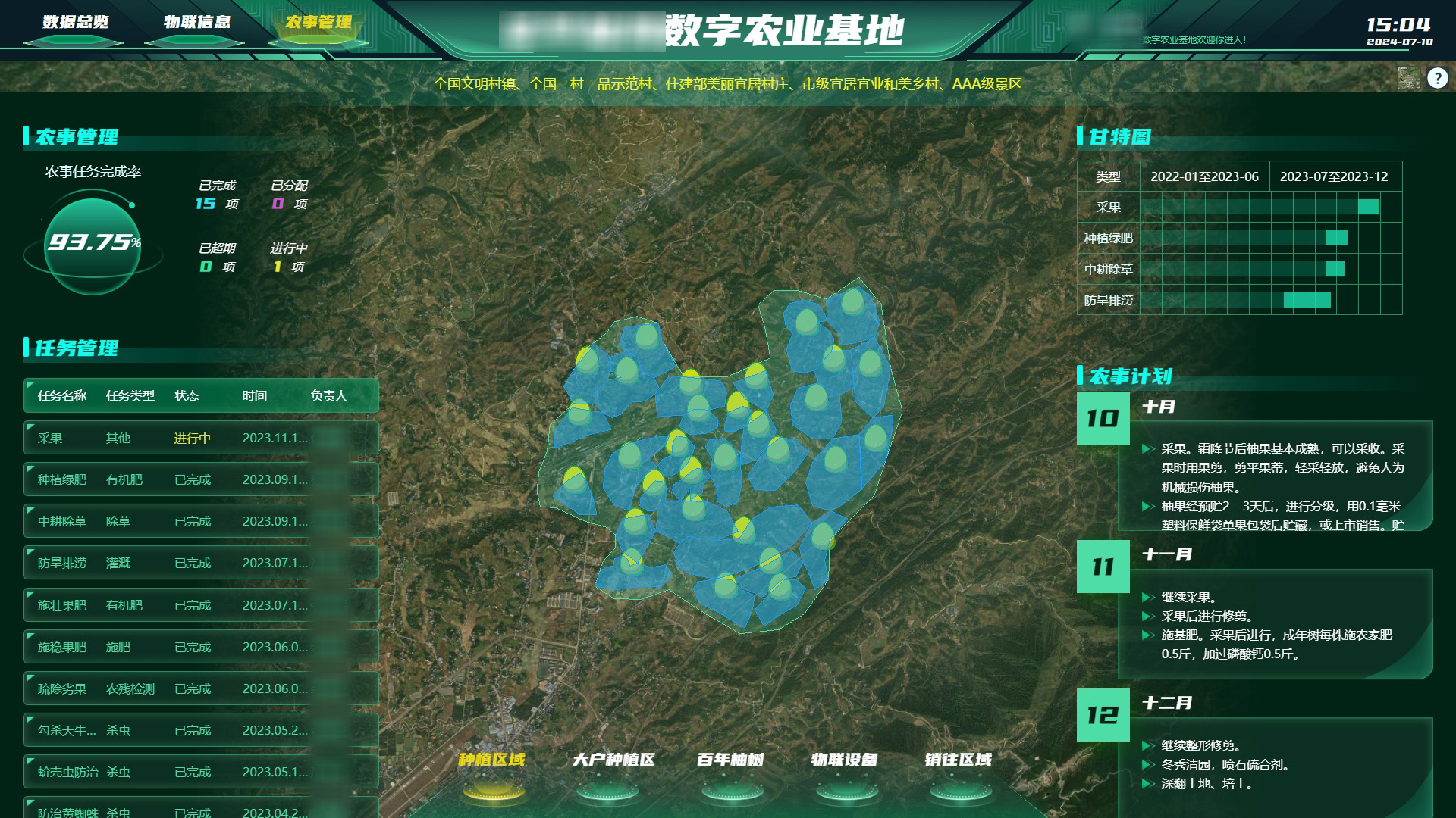 可视化大数据平台:统筹种植区信息、物联设备、农事任务等内容,可视化展示区域内设备状态与控制、产品销售溯源、农事计划与管理等实时数据。
