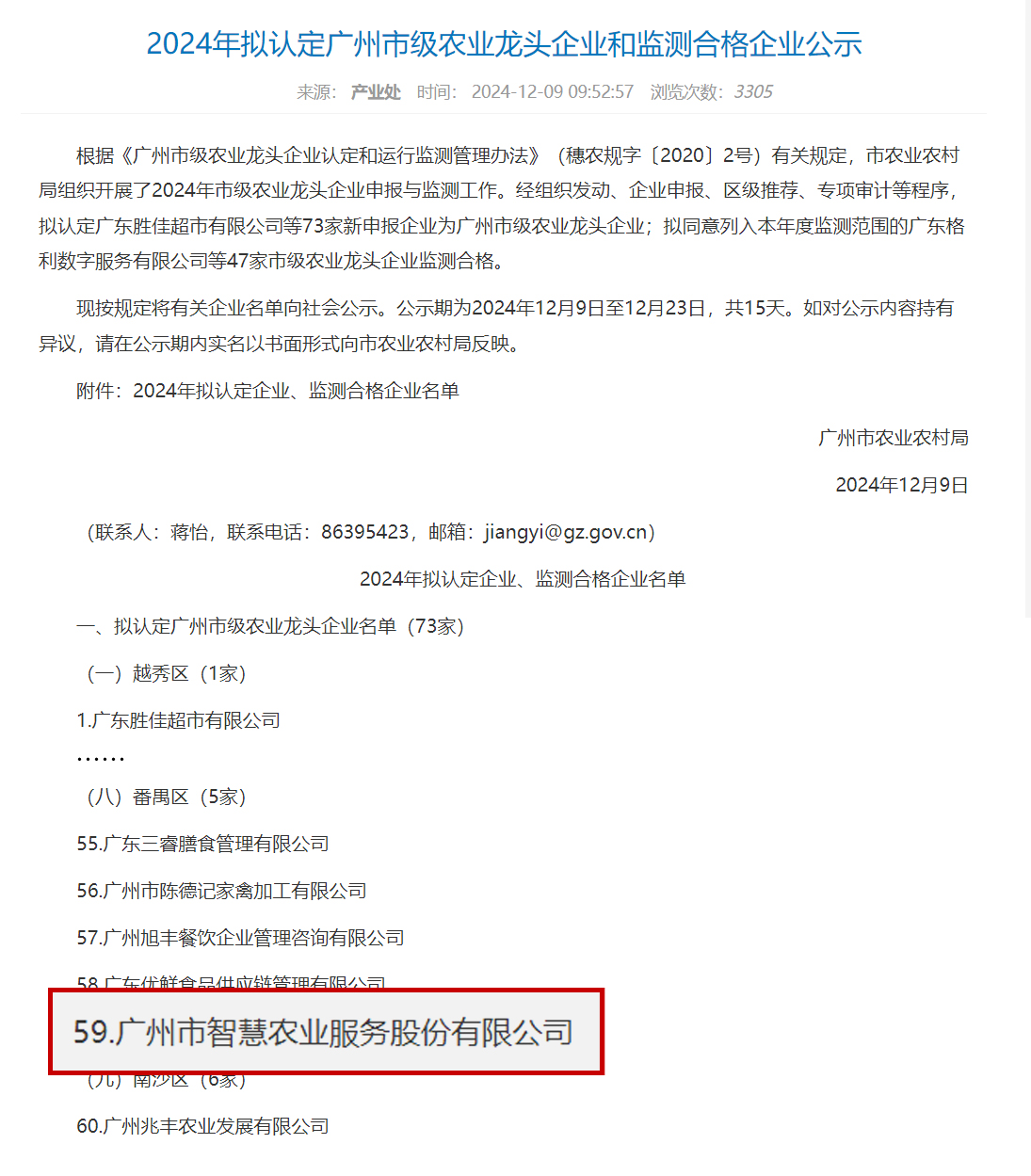 近日,广州市农业农村局公示了新认定的73家广州市级农业龙头企业名单,其中,广州市智慧农业服务股份有限公司有幸获得认可,榜上有名!